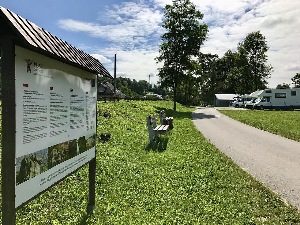 Beaux emplacements près du terrain de sport. Électricité, eau, vidanges, bac à vaisselle... Ne manquez pas à 1 km, par un petit sentier forestier, la superbe église en bois et la statue de Jean-Paul II. À proximité de celle-ci, petit supermarché de l'autre coté du pont.